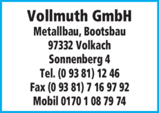 Die Adresse von Vollmuth GmbH lautet: Sonnenberg 4, 97332 Volkach