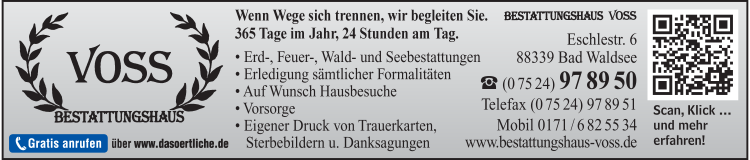 Die Adresse von Voss Angelika Bestattungen lautet: Eschlestr. 6, 88339 Bad Waldsee