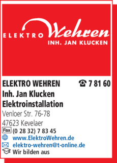 Die Adresse von WEHREN ELEKTRO Inh. Jan Klucken lautet: Venloer Str. 76-78, 47623 Kevelaer