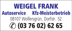 WEIGEL FRANK Autoservice 037602 62 65 Kirchberg Dorfstr. 52 08107 Wolfersgrün
