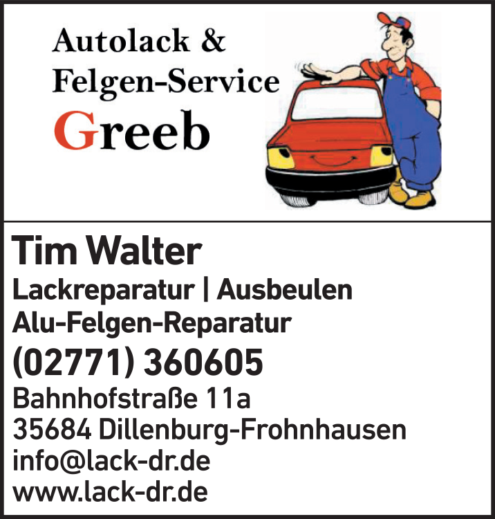Walter Tim Autolack-Service 02771 36 06 05 Dillenburg-Frohnhausen Bahnhofstr. 11 a 35684 Frohnhausen