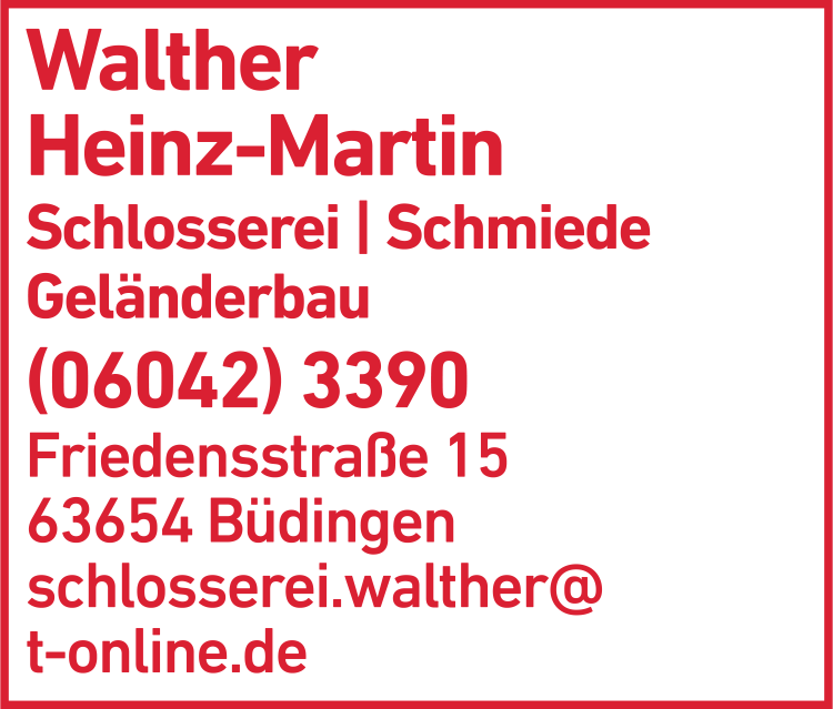 Walther Heinz-Martin Schlosserei 06042 33 90 Büdingen Friedensstr. 15 63654 Vonhausen