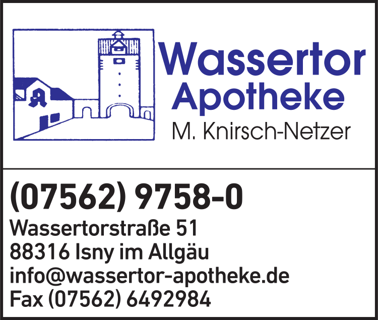 Die Adresse von Wassertor-Apotheke, Inh. Knirsch-Netzer M. lautet: Wassertorstr. 51, 88316 Isny