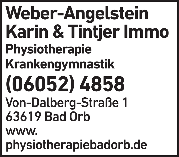 Die Adresse von Weber-Angelstein Karin und Tintjer Immo Praxis für Physiotherapie lautet: Von-Dalberg-Str. 1, 63619 Bad Orb