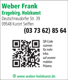Die Adresse von Weber Frank Erzgebirg. Holzkunst lautet: Deutschneudorfer Str. 39, 09548 Kurort Seiffen
