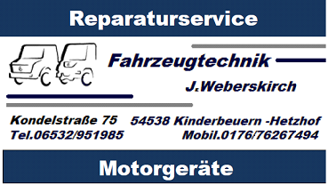 Weberskirch Johannes Fahrzeugtechnik & Motorgeräte 06532 95 19 85 Kinderbeuern-Hetzhof Kondelstr. 75 54538 Hetzhof