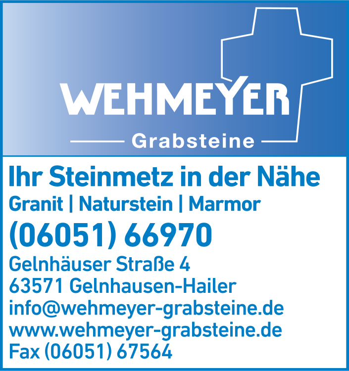Die Adresse von Wehmeyer GmbH Grabsteine lautet: Gelnhäuser Str. 4, 63571 Gelnhausen