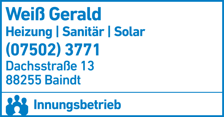Die Adresse von Weiß Gerald Heizungsbau lautet: Dachsstr. 13, 88255 Baindt