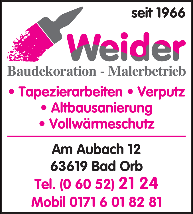 Die Adresse von Weider Karl-Heinz Malerbetrieb u. Baudekoration lautet: Am Aubach 12-16, 63619 Bad Orb