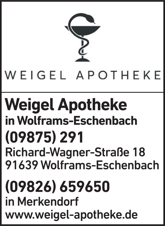 Die Adresse von Weigel Apotheke lautet: Richard-Wagner-Str. 18, 91639 Wolframs-Eschenbach