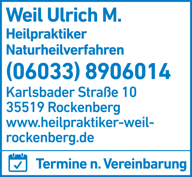 Die Adresse von Weil Ulrich M. Naturheilpraxis lautet: Karlsbader Str. 10, 35519 Rockenberg
