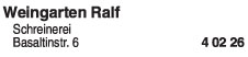 Die Adresse von Weingarten Ralf lautet: Basaltinstr. 6, 57647 Enspel