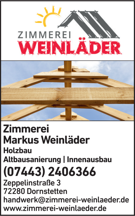 Die Adresse von Weinläder Markus Zimmerei lautet: Zeppelinstr. 3, 72280 Dornstetten