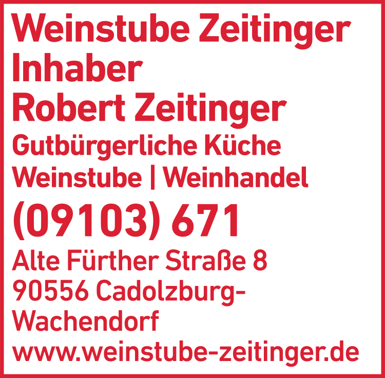 Die Adresse von Weinstube Zeitinger lautet: Alte Fürther Str. 8, 90556 Cadolzburg