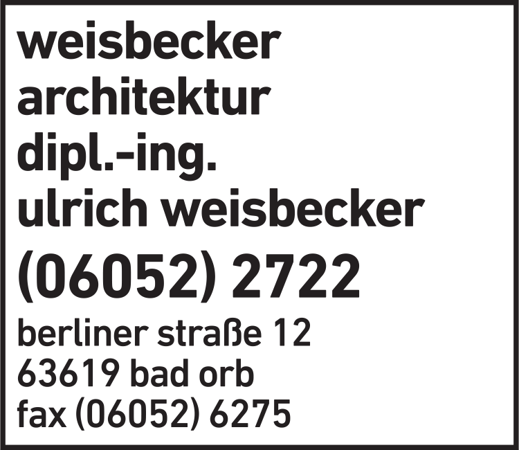 Die Adresse von Weisbecker Ulrich Architekt lautet: Berliner Str. 12, 63619 Bad Orb