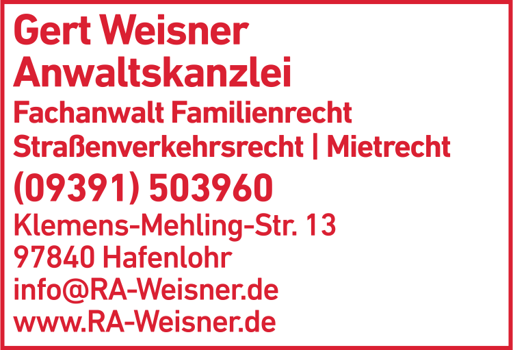 Die Adresse von Weisner Gert lautet: Klemens-Mehling-Str. 13, 97840 Hafenlohr