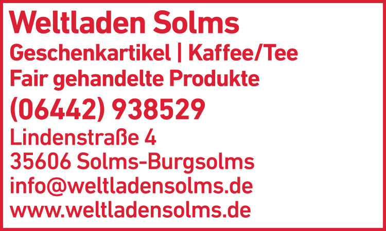 Weltladen ökumenisch & fair 06442 93 85 29 Solms Lindenstr. 4 35606 Burgsolms