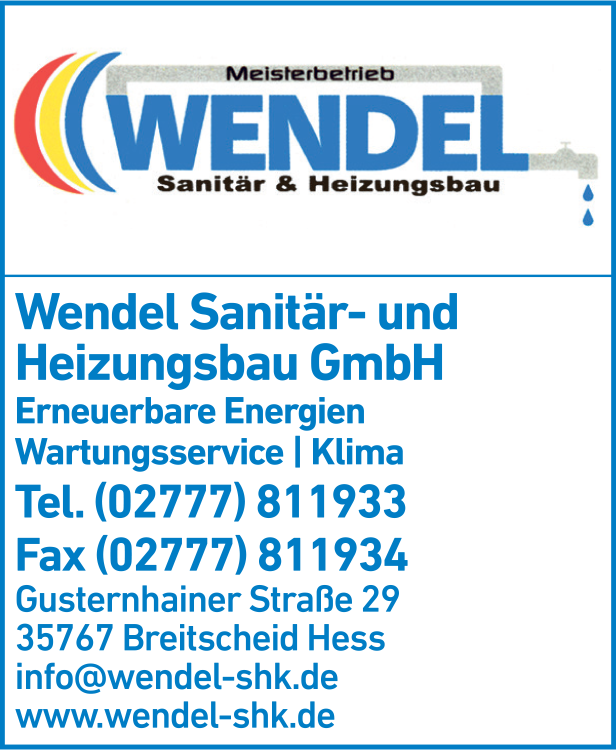 Die Adresse von Wendel GmbH Sanitär & Heizungsbau lautet: Gusternhainer Str. 29, 35767 Breitscheid