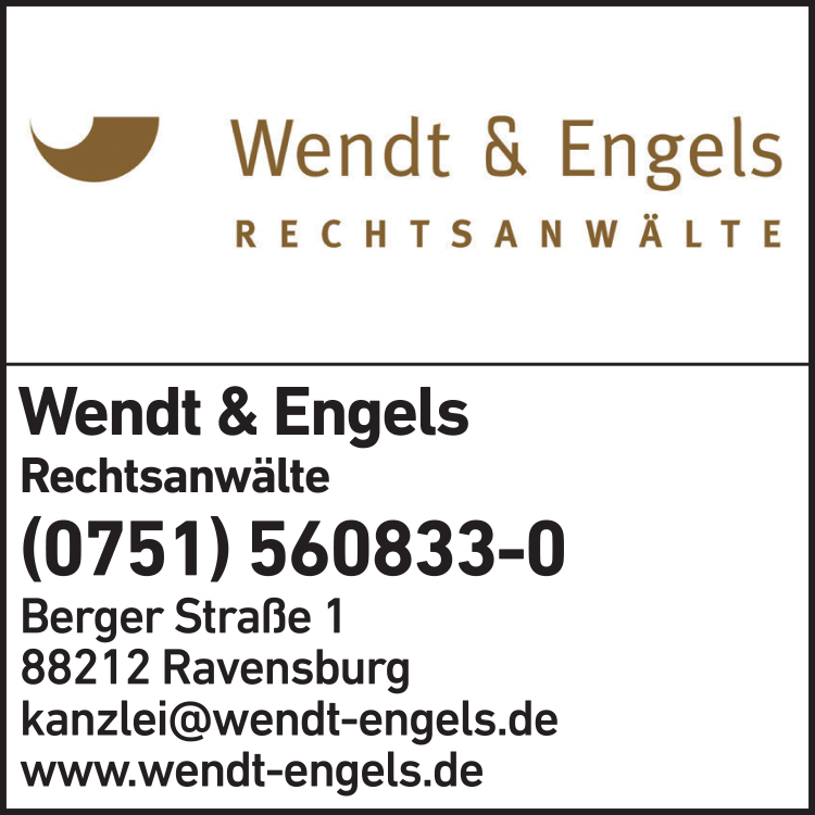 Die Adresse von Wendt & Engels Rechtsanwälte lautet: Berger Str. 1, 88212 Ravensburg