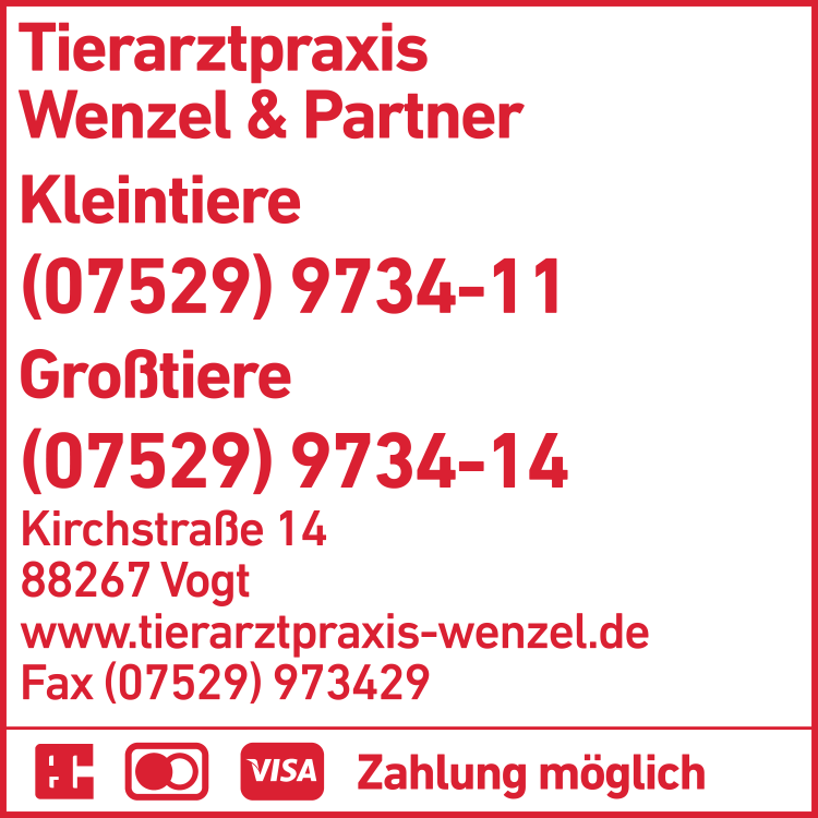 Die Adresse von Wenzel & Partner Tierarztpraxis lautet: Kirchstr. 14, 88267 Vogt