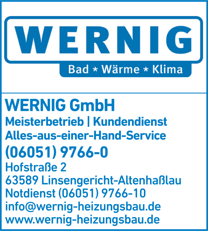 Die Adresse von Wernig GmbH Bad, Heizung, Klima und Sanierungen lautet: Hofstr. 2, 63589 Linsengericht