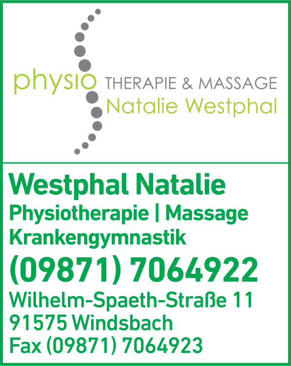 Die Adresse von Westphal Physio-Therapie lautet: Wilhelm-Spaeth-Str. 11, 91575 Windsbach