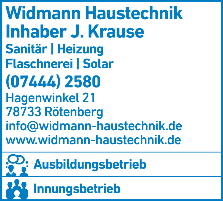 Die Adresse von Widmann Haustechnik Inh. J. Krause lautet: Hagenwinkel 21, 78733 Aichhalden