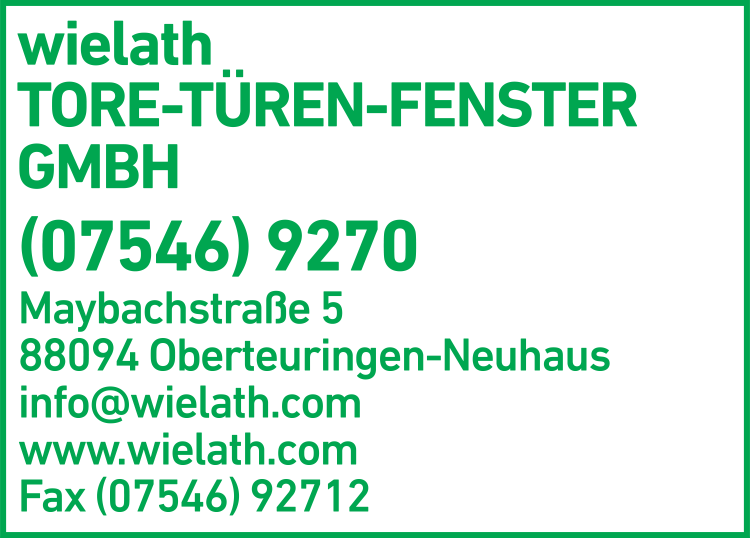 Die Adresse von Wielath Tore-Türen-Fenster GmbH lautet: Maybachstr. 5, 88094 Oberteuringen