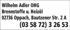 Die Adresse von Wilhelm Adler OHG lautet: Bautzener Str. 2 A, 02736 Oppach