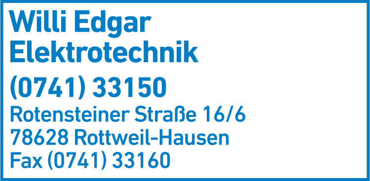 Die Adresse von Willi Edgar Elektrotechnik lautet: Rotensteiner Str. 16/6, 78628 Rottweil-Hausen