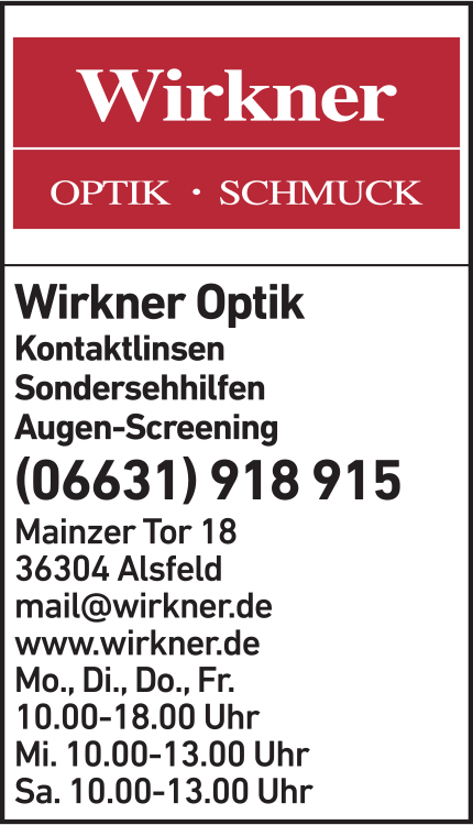 Die Adresse von Wirkner Optik-Schmuck lautet: Mainzer Tor 18, 36304 Alsfeld