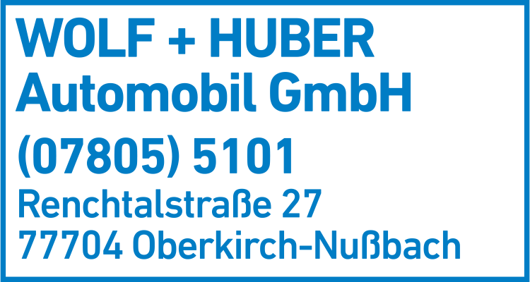 Die Adresse von Wolf + Huber Automobil GmbH lautet: Renchtalstr. 27, 77704 Oberkirch