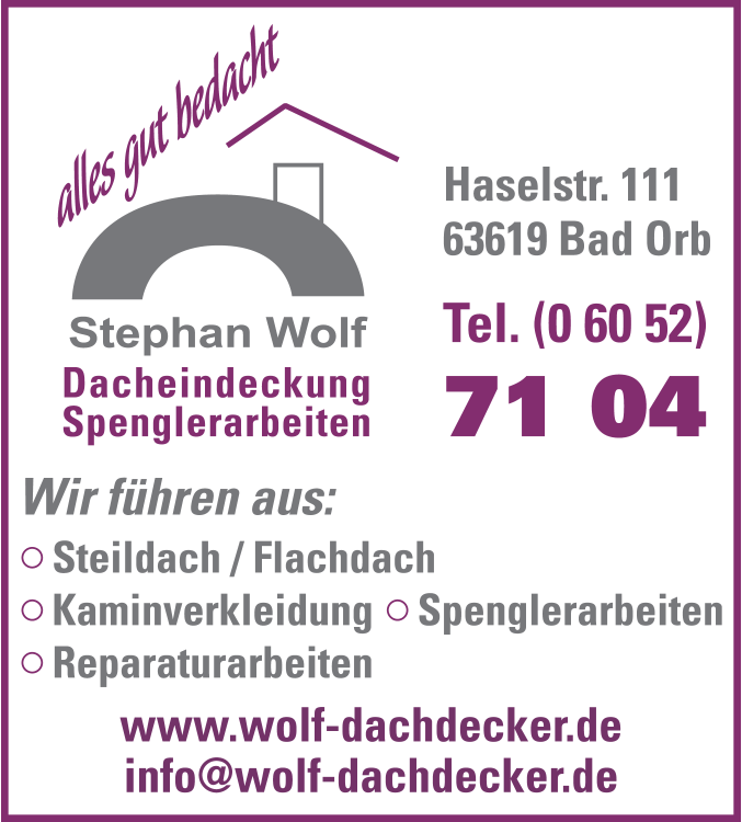 Die Adresse von Wolf Stephan Dachdecker lautet: Haselstr. 111, 63619 Bad Orb