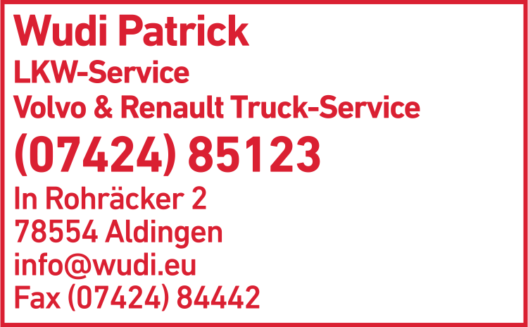 Die Adresse von Wudi Patrick LKW-Service lautet: In Rohräcker 2, 78554 Aldingen