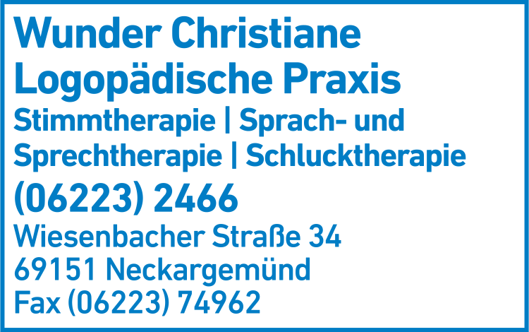 Die Adresse von Wunder Christiane Logopädie lautet: Wiesenbacher Str. 34, 69151 Neckargemünd