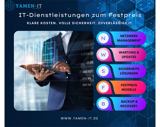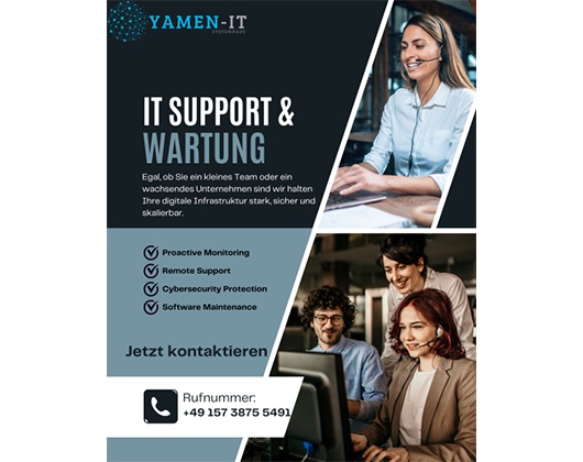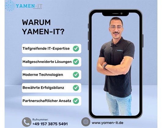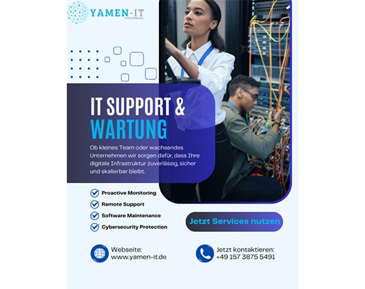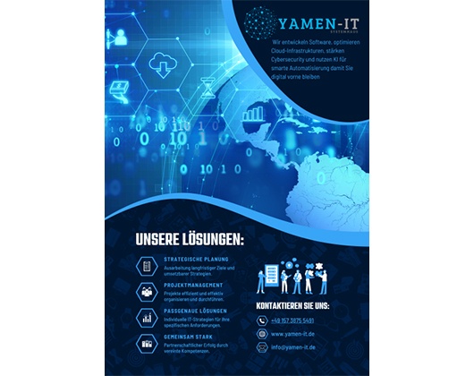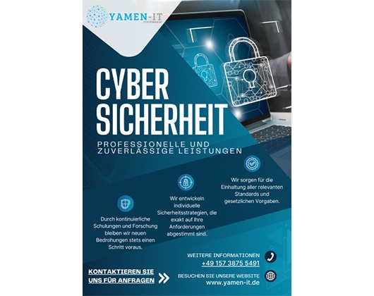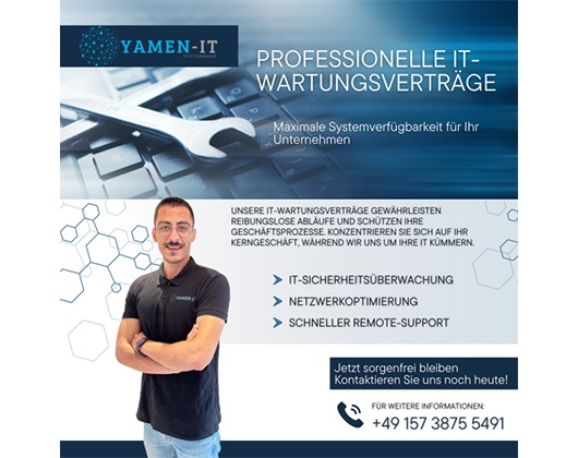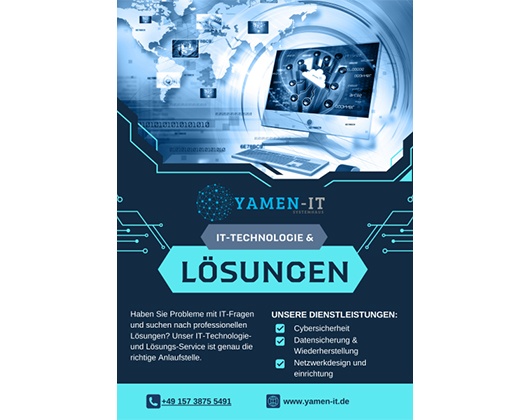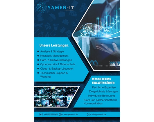 | Yamen-IT - Ihr IT-Systemhaus für ganz Deutschland. Yamen-IT bietet maßgeschneiderte IT-Lösungen für Unternehmen jeder Größe - bundesweit. Ob Netzwerktechnik, Serverlösungen, IT-Sicherheit, Cloud-Dienste oder zuverlässiger IT-Support: Wir sorgen für eine sichere und stabile IT-Infrastruktur. Persönlich, kompetent und lösungsorientiert. IT-Dienstleistungen aus einer Hand - Cybersecurity & Datenschutz - Cloud- und Serverlösungen. Schneller Support - vor Ort. |