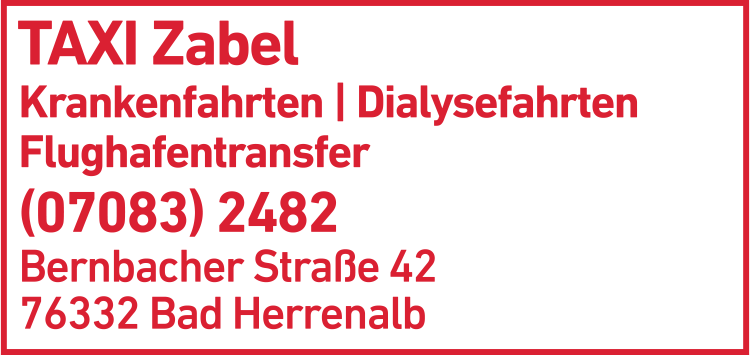 Die Adresse von Zabel Taxi lautet: Bernbacher Str. 42, 76332 Bad Herrenalb
