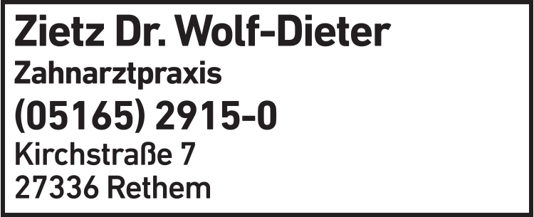 Die Adresse von Zahnarztpraxis Dr. Zietz Wolf-Dieter lautet: Kirchstr. 7, 27336 Rethem