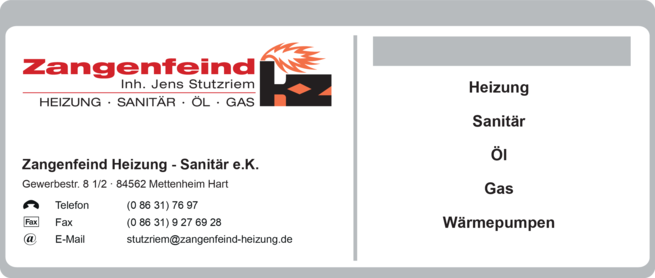 Zangenfeind Heizung - Sanitär e.K. bietet Heizung, Sanitär, Öl, Gas, Wärmepumpen und Sanitärinstallationen an.
