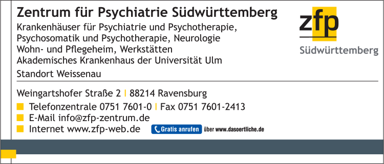 Die Adresse von Zentrum für Psychiatrie lautet: Weingartshofer Str. 2, 88214 Ravensburg
