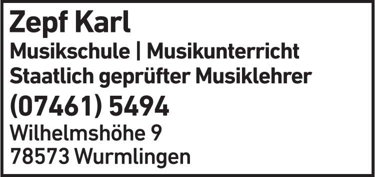 Die Adresse von Zepf Karl Musikschule lautet: Wilhelmshöhe 9, 78573 Wurmlingen