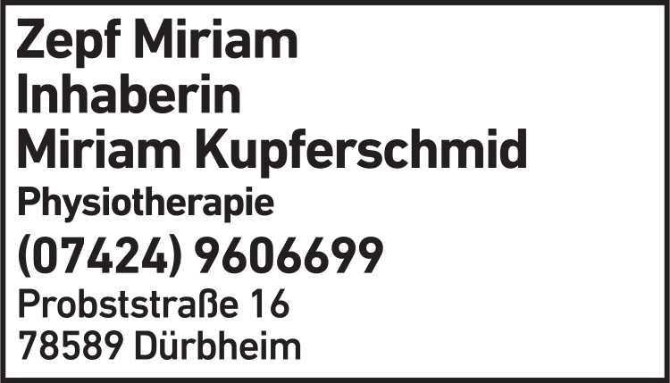 Die Adresse von Zepf Miriam Physiotherapie lautet: Probststr. 16, 78589 Dürbheim