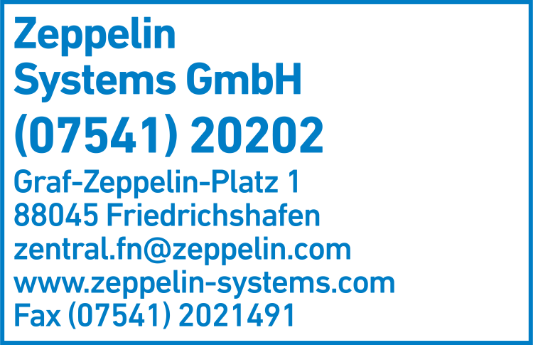 Die Adresse von Zeppelin Systems GmbH lautet: Graf-Zeppelin-Platz 1, 88045 Friedrichshafen