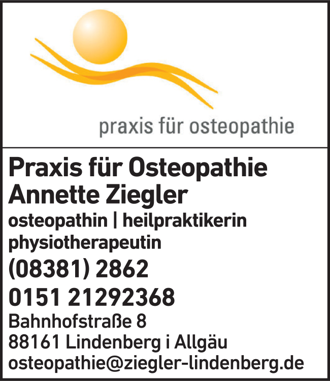 Die Adresse von Ziegler Annette Praxis für Osteopathie lautet: Bahnhofstr. 8, 88161 Lindenberg