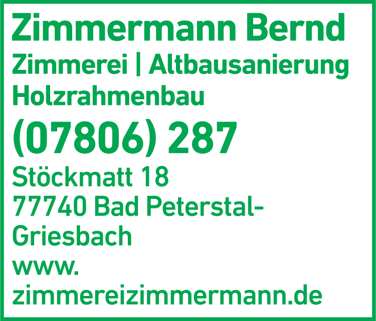 Die Adresse von Zimmermann Bernd Zimmerei lautet: Stöckmatt 18, 77740 Bad Peterstal-Griesbach
