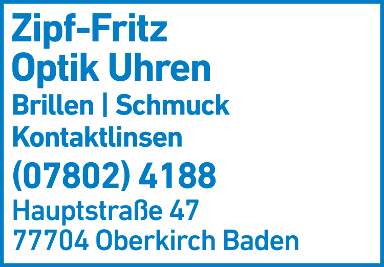 Die Adresse von Zipf-Fritz Optik Uhren lautet: Hauptstr. 47, 77704 Oberkirch