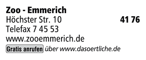 Zoo - Emmerich hat montags bis freitags von 09:00 - 12:30 Uhr und 14:30 - 18:30 Uhr und samstags von 08:30 - 13:00 Uhr geöffnet.