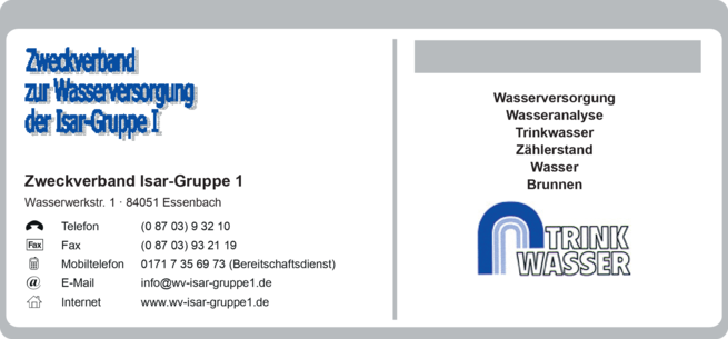 Zweckverband Isar-Gruppe I bietet Wasserversorgung, Zählerstand, Wasseranalyse, Trinkwasser, Wasser, Brunnen, Verbände, Wasserversorgungsanlagen und Zweckverband an.