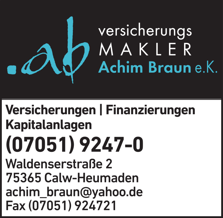 Die Adresse von ab Achim Braun Versicherungsmakler e.K. lautet: Waldenserstr. 2, 75365 Calw