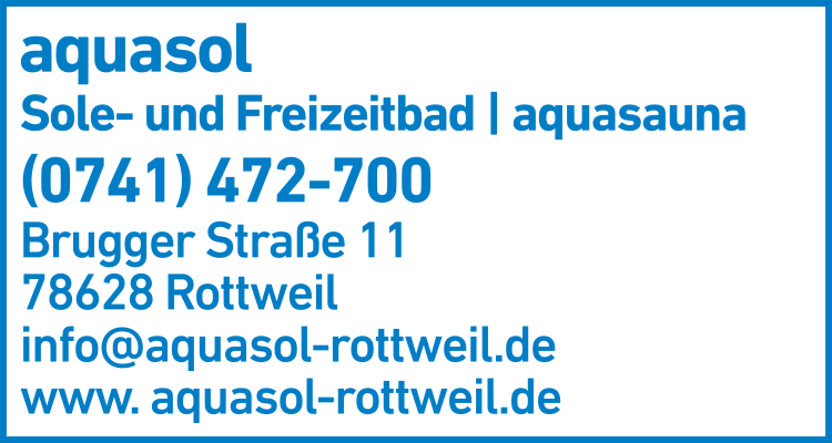 Die Adresse von aquasol Sole-und Freizeitbad lautet: Brugger Str. 11, 78628 Rottweil